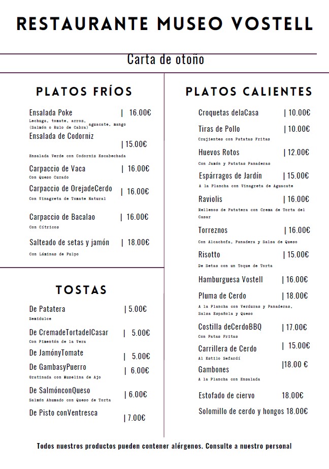El establecimiento de Cafetería Restaurante Museo Vostell se encuentra localizado en un enclave único al estar ubicado en uno de los patios del Museo Vostell Malpartida. Ofrecen al cliente una amplia carta fija según temporada y sugerencias fuera de carta, variantes cada semana, conforme a las ofertas actuales de mercado. Cafetería Restaurante Museo Vostell es especialista en asados. Además, ofrece una carta selecta de cervezas, vino e infusiones. Tiene servicio de recogida de comida bajo petición previa. Asimismo, es un establecimiento acomodado para celebrar pequeños acontecimientos. Cafetería Restaurante Museo Vostell alberga entre sus instalaciones una extensa terraza disponible durante todo el año.