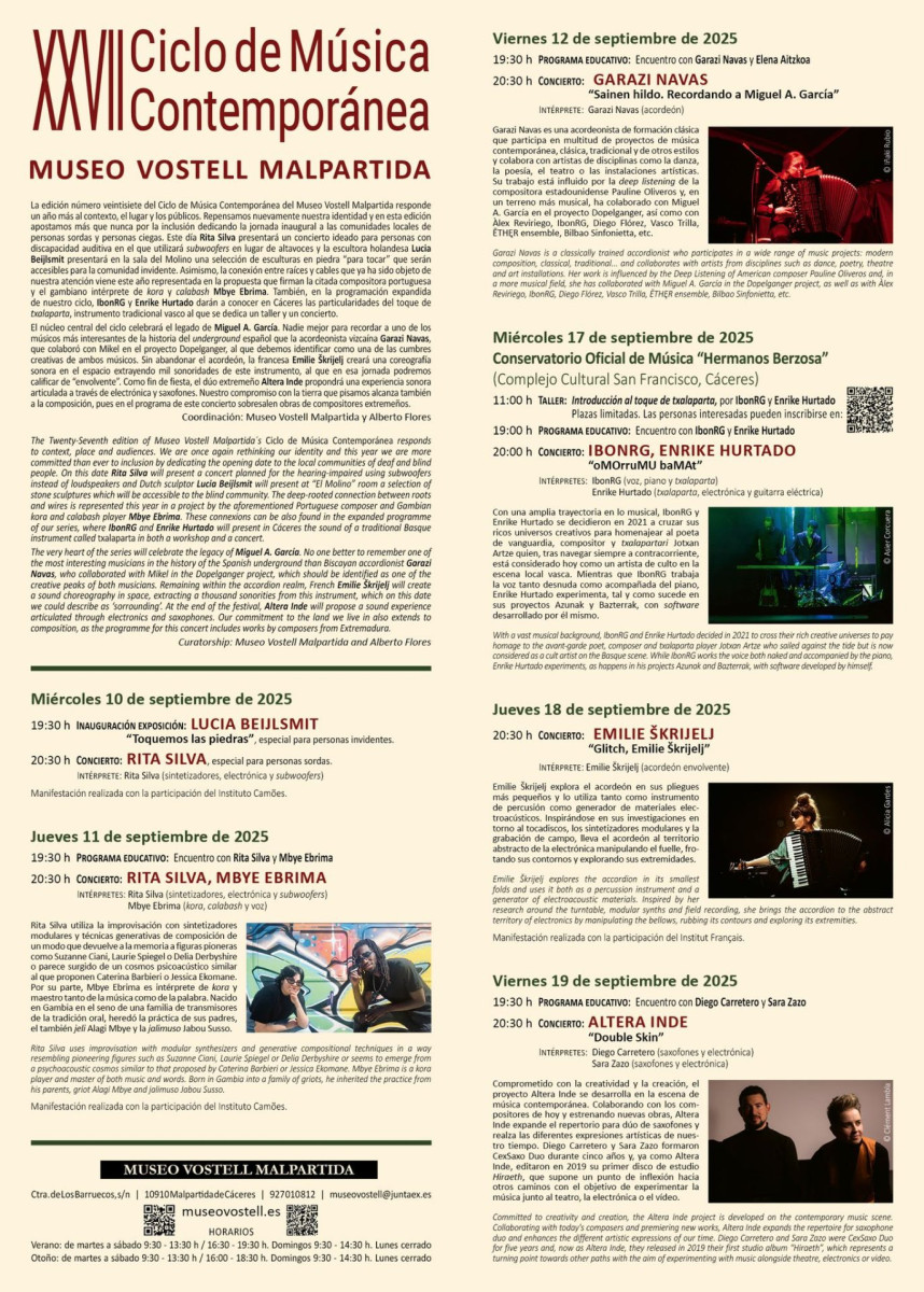 Vigesimoséptima edición del Ciclo de Música Contemporánea del Museo Vostell Malpartida, donde se dan cita las más importantes figuras del panorama nacional e internacional.